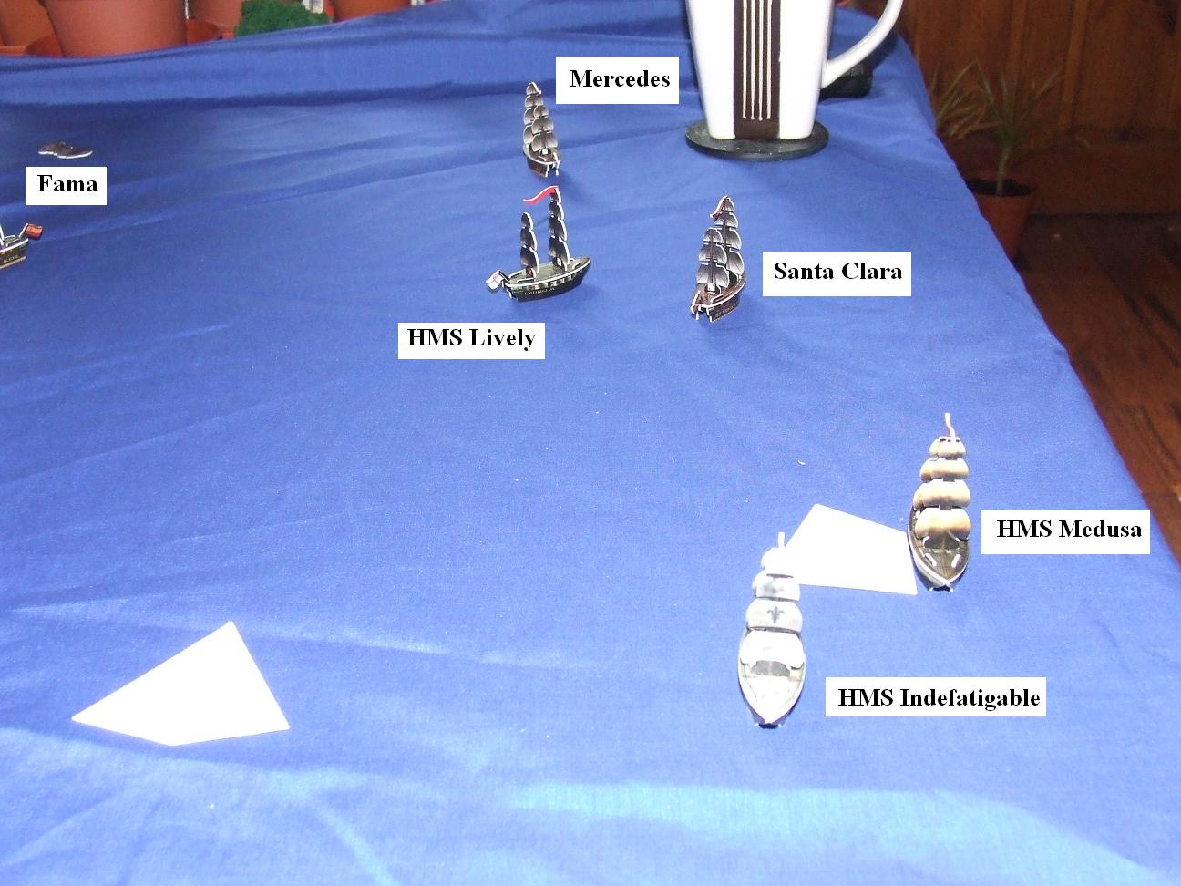 HMS Lively, Amphibian and Medusa all combine to give the Spanish Fama a good licking, who sees her Foremast taken down. The Fama and the Mercedes return fire at the British ships, the Spanish gunnery proving most ineffective with only minor damage to the British.